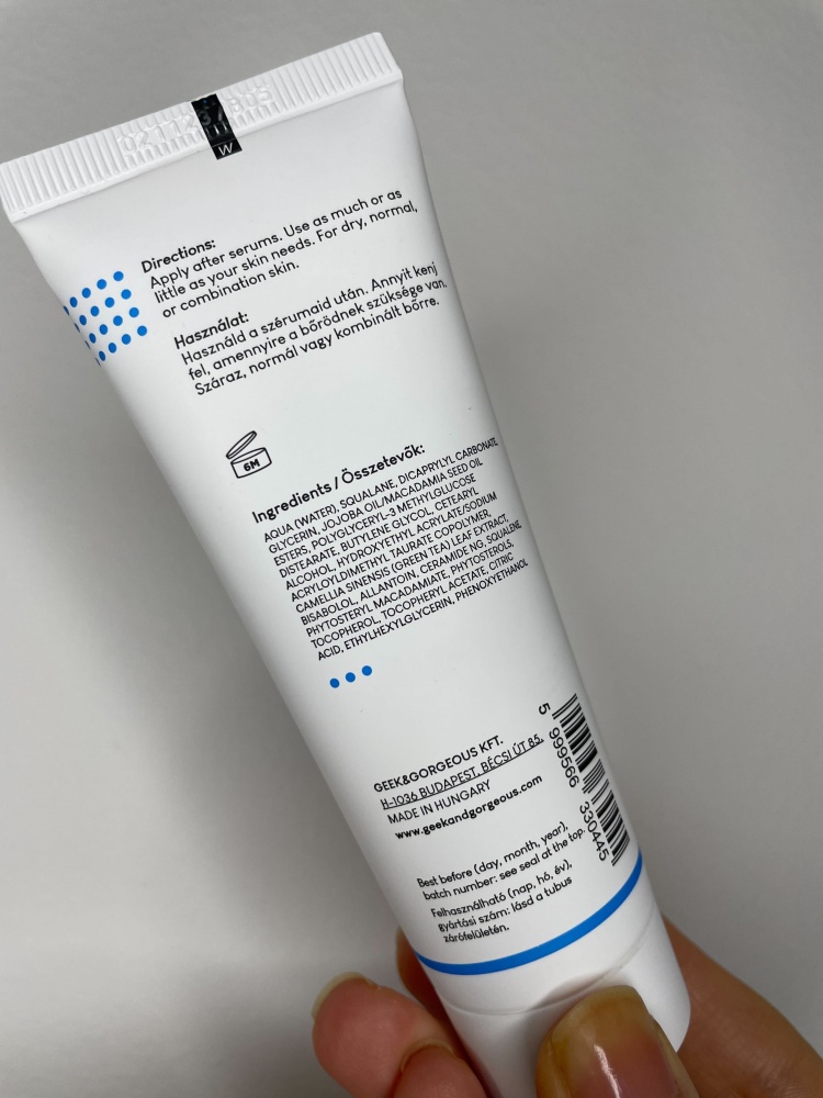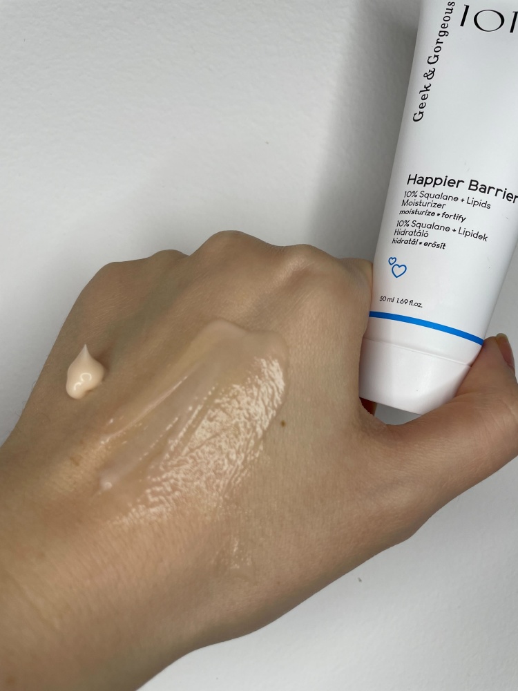 Hľadala som nočný krém, ktorý nahradí moje ľahké gél-krémy v zimnom období, keď centrálne kúrenie a suchý/studený vzduch dáva zabrať aj mojej zmiešanej/mastnej pleti. Mám doma obidva krémy od Geeku: Hydration Station používam ráno a Happier Barrier večer. Pre moju pleť je táto kombinácia totálne ideálna. Manžel (citlivá pleť so sklonom k dermatitíde) je s ním tiež veľmi spokojný. Nezanecháva lesklý finiš, len jemnú emolientnú vrstvu, ktorá nie je lepkavá, ťažká alebo inak nepríjemná. Pre suchšiu pleť bude ideálny aj ako denný krém, pre moju je trochu "too much" v rannej rutine.