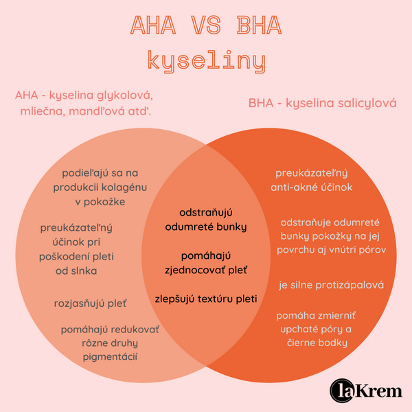 1. AHA kyseliny - sú ideálne pre suchú, namáhanú, starnúcu, zmiešanú, mastnú a problematickú pleť a v kozmetike sú najviac používané. Nazývajú sa aj “ovocné kyseliny”, pretože prírodne sa vyskytujú najmä v ovocí. Sú rozpustné vo vode a exfoliujú predovšetkým vrchnú vrstvu pokožky. Najúčinnejšia z AHA kyselín je